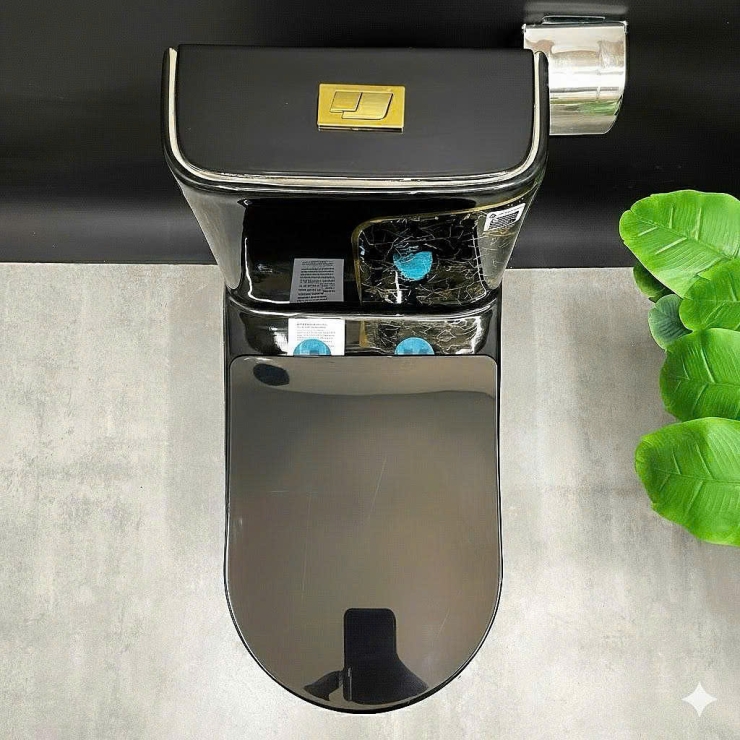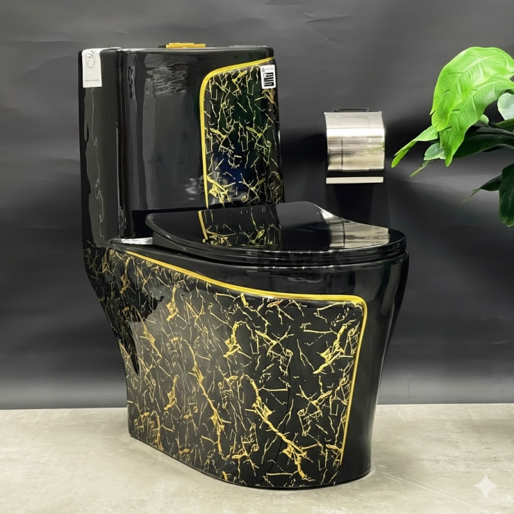 Bồn Cầu 1 Khối Đen Vân đá + Sọc Vàng LUSENTER (BCMK38)
