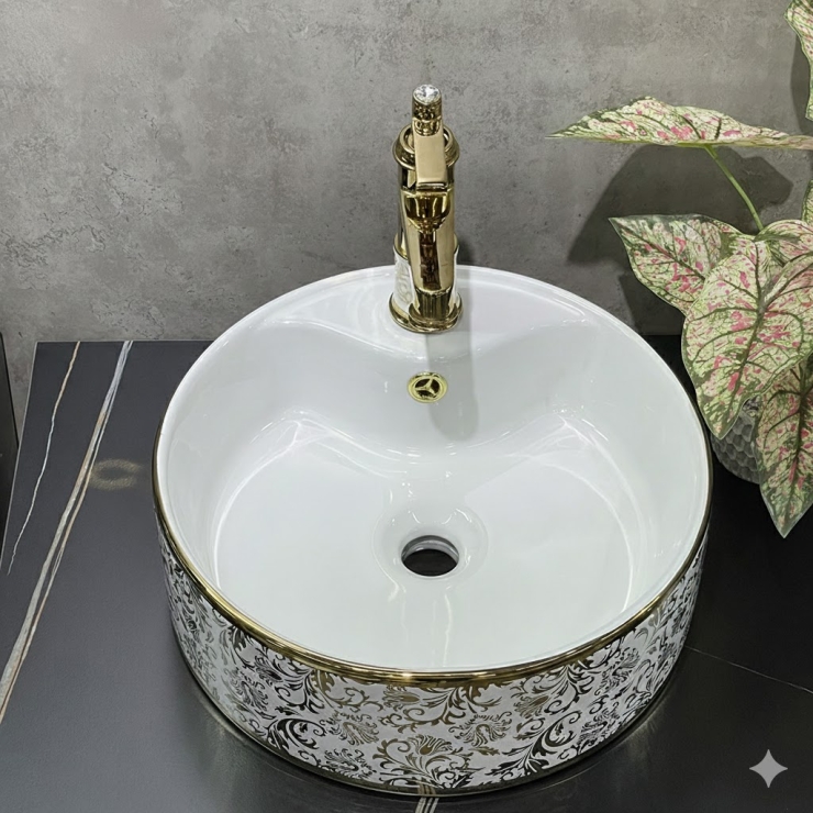 Lavabo Tròn Họa Tiết Lá Viền Vàng LUSENTER (LB23)