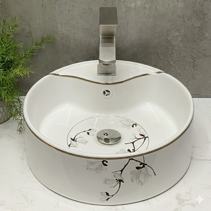 Lavabo Tròn Họa Tiết Hoa Viền Vàng LUSENTER (LB21)