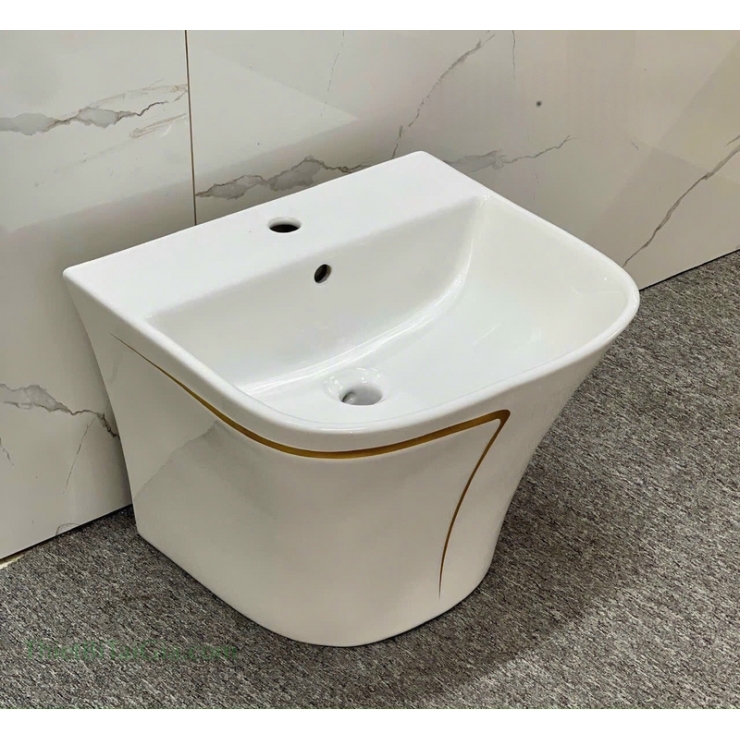 - Kiểu dáng: Lavabo treo tường liền khối trắng, kẻ sọc vàng mềm mại, miệng chậu chữ nhật thon nhỏ dần xuống chân như một hình thang ôm sát vào tường, tạo sự chắc chắn khi sử dụng, mang lại không gian thanh lịch, sang trọng.