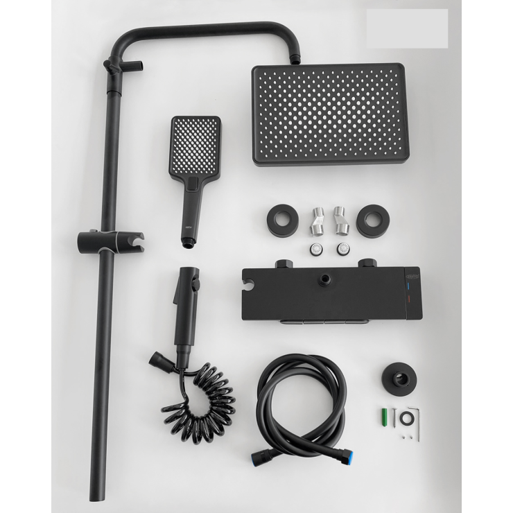Bộ sản phẩm gồm: 1 củ sen, 1 dây dẫn nước, 1 tay sen, 1 bát sen, 1 vòi xịt, 1 bộ ống đứng, ốc nối và các vít đi kèm.